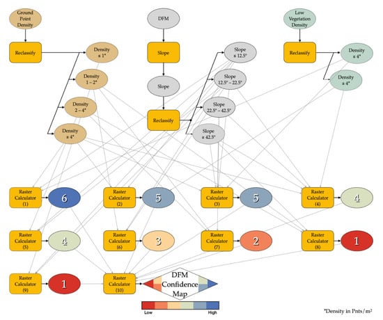 The tools required to compute a DFM confidence map—reclassification, slope, and raster calculator—are included in most GIS packages, and the process involves relatively low computational costs. However, the pipeline is relatively complex, consisting of 21 individual steps and 40 connections (Figure 4).