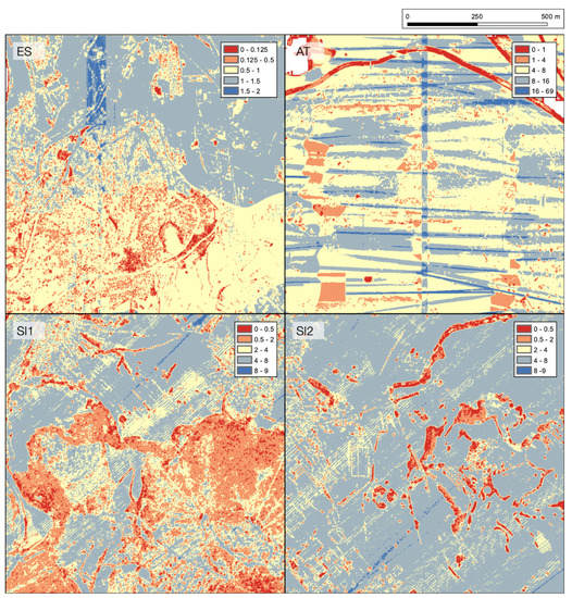 We have produced DFM confidence maps for each of our test sites at resolutions suitable to the data quality: 0.25 m for AT, 0.5 m for SI1 and SI2, and 1 m for ES (Figure 8). Looking at the structure of the maps it immediately becomes apparent that “orange” areas (confidence level two) are predominantly defined by steep slopes. As a consequence, these tend to appear in contiguous areas. Additionally, smaller—but still contiguous—“red” areas (confidence level one) that have been caused by dense vegetation or very low point density—for example, those caused by water bodies—are also apparent. These two landscape types are where the key differences between DFM confidence maps (Figure 7) and ground point density maps (Figure 6) appear. Other areas are often highly dispersed and directly comparable to ground point density.