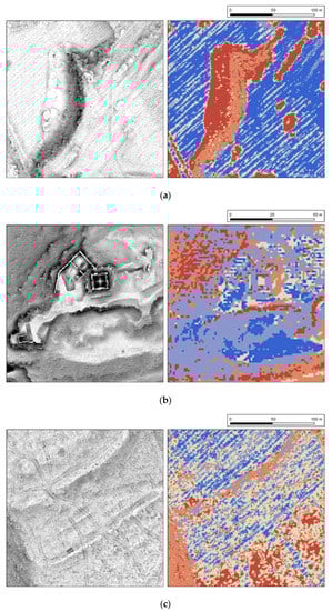 In “red” areas, the terrain could not be accurately predicted by any algorithm, and only algorithm artefacts were observed [62]—in this case, the triangular pattern. In “orange” areas this effect was still discernible (Figure 9a,b). Following the artefacts, both the “red” and the “orange” areas were a good match to the artefacts on the DFM. The same can be said for the “blue” areas (confidence levels five and six), which were perfect matches for the areas of highest visual quality (Figure 9b). “Transition” areas (confidence three and four) did not exhibit direct visual artefacts. However, looking at the selected features in detail confirmed the established confidence levels. We turned, for example, to the tracks left by heavy machinery clearing the forest after the ice rain disaster (Figure 9c). These tracks were about as wide as the size of the grid cell, but more pronounced than typical archaeological features. The fact that the tracks were not reproduced in full is proof that the quality of the DFM in that area was indeed not perfect, which is in line with confidence levels three and four.