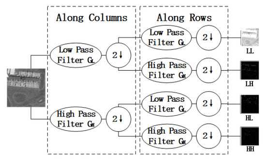 A typical Haar WT operation is showed in Figure 2. As illustrated in Figure 2, LL is the low frequency sub-band of the original image, which represents the global topology. The other three sub-bands (HL, LH and HH in the figure) represent the high frequency part in vertical, horizontal and diagonal orientations, respectively. By the way, using the inverse implementation of wavelet transformation, we could acquire the final image with these four sub-band coefficients.