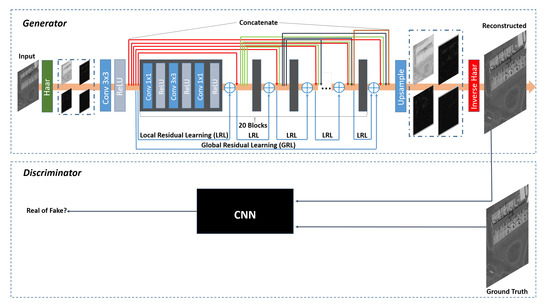 In our generator, residual learning and dense connection are the most important implementations. Residual learning is learning the residual between the input and output, so in this article, we define a residual , most of which may be zero or less [14]. In this equation, r is the residual pixel of x and y. Dense connection is defined as , where refers to the concatenation of feature-maps produced in layers [13].