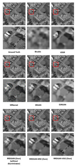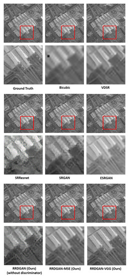 Generally, image SR reconstruction and denoising methods mean adding useful information (HR details) to LQ images and removing useless information (noise) from LQ images, respectively. Due to the existence of multiple solutions for any pixel in a LR image, SR methods are ill-posed problems [2]. Basically, SR methods include Single Image Super-Resolution (SISR) and Multi-Image Super-Resolution (MISR) according to the number of LR image, because, in the field of remote sensing research, image data are not abundant. However, the MISR method obtains HR images by processing a set of LR images which have only slightly different views, so the SISR method is commonly used in the remote sensing field, which acquires a HR image through a single LR image. Interpolation-based [3,4], reconstructed-based [5,6] and example-based [7] are three common classifications of SISR methods. This article does not discuss interpolation-based methods and reconstructed-based methods since these two types of methods are usually treated as traditional methods. For example, moments-based methods are very popular in image reconstruction [8,9,10,11]. Example-based methods establish the relationship between LR and HR images to reconstruct the high-frequency part of the LR images. In recent years, with the development of big data technology, machine learning methods have become increasingly popular and practical. Deep learning methods, which usually mean deep convolutional neural networks (CNN) [12,13,14], are currently one of the research hot-spots. Deep learning methods have achieved impressive results in many fields such as image processing. In particular, the SR algorithm based on deep learning has achieved significantly better results than the traditional SR reconstruction algorithm [15,16,17,18,19]. This algorithm has also achieved excellent results in the field of SR reconstruction of remote sensing images [7,20,21]. SRCNN, which is the first SR method based on CNN, was proposed by Dong et al. [2,22]. SRCNN borrows the idea of parse-coding SR method. However, if SRCNN deepens the number of layers, it will become very difficult to train. Then, with the emergence of residual learning techniques, deeper networks could be designed to achieve better results. The VDSR published by Kim et al. [23] is the earliest and most typical method of using residual learning. Recently, Generative Adversarial Network (GAN) based methods are getting popular because these methods could generate more interesting results. SRGAN [24] is the first GAN-based SR method that could reconstruct more details than the normal non-GAN-based method. After that, ESRGAN [25] is proposed, which is the enhancement of SRGAN, and this method achieved the state-of-the-art effect that time.