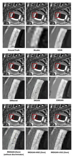 By the way, we also did some experiments to verify whether the performance of RRDGAN is better than implementing denoising method (BM3D Algorithm [43] or Non-Local Means method [44], which are two of the best denoising method) first, then SR method followed. Figure 17 shows the result that RRDGAN is better than using the combination of BM3D (or NLM) and RRDGAN. We can see that the result of the combination of BM3D (or NLM) and RRDGAN is smoother than the result of using RRDGAN directly.