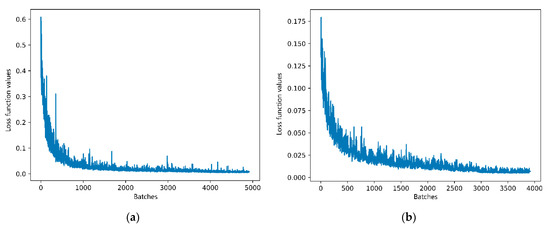(a) The change of loss function values of YOLOv3 to train real TC images; (b) the change of loss function values of NDFTC to train real TC images.
