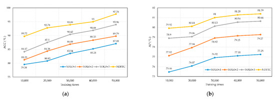 Figure 4 shows the ACC and AP of NDFTC and other models in the test set when the training times were 10,000, 20,000, 30,000, 40,000, and 50,000. Apparently, Figure 4 reflects that NDFTC performed better than YOLOv3 and other models with the same training times. Finally, the experimental results show that the NDFTC had better performance, with an ACC of 97.78% and AP of 81.39%, in comparison to the YOLOv3, with an ACC of 93.96% and AP of 80.64%.