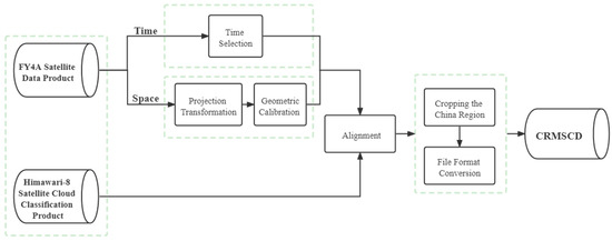 Based on FY-4A satellite data and Himawari-8 observation data, we carried out detailed preprocessing work. First, we screened FY-4A satellite data on a time scale based on solar illumination, and simultaneously performed projection transformation and geometric correction on a spatial scale. Then, the processed data were aligned with Himawari-8 observation data. Finally, the final dataset CRMSCD was obtained by cropping the China region and converting the file format. The detailed data processing flow is shown in Figure 2.