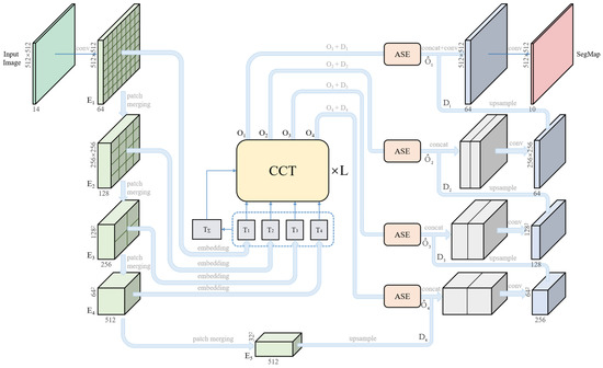 We tokenize the output feature maps of the transformer layers at 4 different scales corresponding to E1~E4 in encoder, and reshape the features into flattened 2D patches with patch sizes , respectively, so that the patches can be mapped to the same areas of the encoder features at four scales. We use the 4 layers of tokens , as queries, and then concatenate the tokens of four layers to obtain as the key and value. We input the and into the Channel-wise Cross Fusion Transformer (CCT) [47], and use the transformer’s long-distance dependent modeling advantages to fuse four different scale encoder features. In order to better assign attention weights and make the gradient smoothly propagated, we conduct the attention operation along the channel axis rather than the patch axis.
