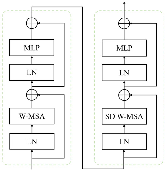 Two successive swin transformer blocks in encoder. W-MSA and SD W-MSA are Window-based Multi-head Self-Attention and Window-based Multi-head Self Attention with spatial displacement, respectively.