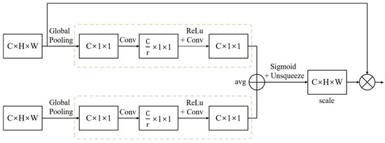 where c is the c-th channel, k is the k-th layer. Then, in order to improve the generalization ability of the model and better learn the nonlinear relationship between different channels, we perform an excitation operation [48] to reduce the dimension of feature channels, and restore the original dimensions to obtain and after using Rectified Linear Unit (ReLU) activation function. We use 1 × 1 convolution in specific operations: