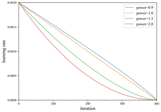 where is the initial learning rate, is the decay index, is the current training step size, and is the maximum training step size. When we establish to be equal to 1, the learning rate decay curve is a straight line. When , the decay curve of learning rate becomes concave inward. When , the decay curve of learning rate becomes convex outward. Figure 7 shows the decay curves under different power values. We compare four power values in the figure, the effect is better when the power is 1.5. In practice, we set for parameter optimization.