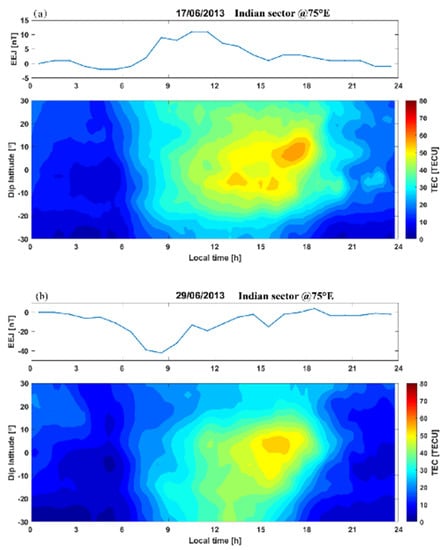 It is reported that the strength of the EIA shows a better correlation with integrated EEJ values than the daily maximum of EEJ [28]. In addition, the time delay of the EIA response to EEJ strength is 2–3 h [27,28]. To identify the days with weak EEJ or CEJ, the averaged ΔH at an LT bin of 0800–1200 is calculated first. Please note that the Weak EEJ or CEJ were combined to be referred to as WEC in this study. Days with WEC were then determined when the averaged ΔH components were less than the threshold value; the remainder of the quiet days were recognized as EEJ days. Our experiments (not shown here) showed that the EEJ intensity was generally higher in the Peruvian sector than in the Indian sector, probably as a result of tidal effects. Thus, we chose two thresholds, ~70 nT and ~20 nT of averaged EEJ intensity during 0800–1200 LT for the Peruvian and Indian sectors, respectively.