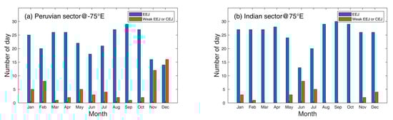 Figure 2 shows the day numbers of the WEC and EEJ cases at longitudes of −75° E and 75° E, which represent the Peruvian and Indian sectors, respectively. The WEC case showed a preferential occurrence during the two solstices at both longitudes, consistent with previous studies which had found that the EEJ is characterized by solstitial minima [29,30,31]. However, for a given longitude, the WEC showed specific seasonal preferences as well. There were more WEC days around the December Solstice (Nov, Dec, Jan, Feb) than the June Solstice (May, Jun, Jul, Aug) in the Peruvian sector, with this preference being reversed in the Indian sector. Considering the northward–southward deviation of the dip equator from the geographic equator at both the Indian and Peruvian longitudes, this implied that more WEC occurred when the dip equator is in the summer hemisphere. One may also note that the WEC day is missed in Mar, Apr, Aug, Sep, and Oct in the Indian sector (Figure 2b).