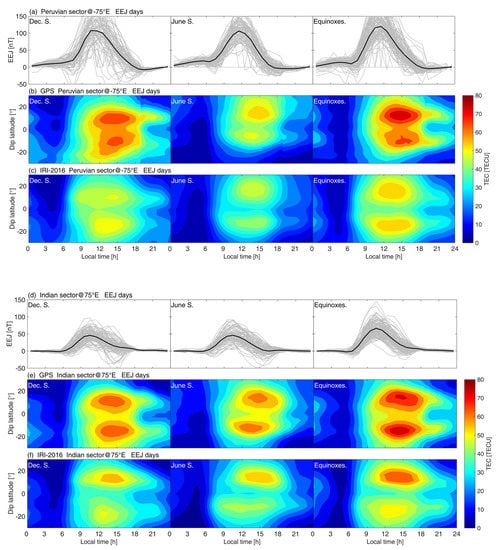 Figure 3 shows the TEC maps during EEJ days in the Peruvian and Indian sectors. The data shown in the left, middle, and right columns represent different seasons: December Solstice (Dec. S., which includes Nov, Dec, Jan, and Feb), June Solstice (June. S., which includes May, Jun, Jul, and Aug), and equinoxes (March, April, September, October), respectively. The daily EEJ was first plotted in Figure 3a,d; solid black lines represent four-month averages.