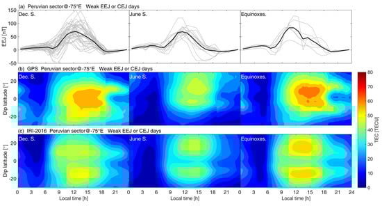 On WEC days (Figure 4), as expected, the EIA barely formed as observed by the GPS TEC. The Peruvian sector even showed a single-peak structure over the equator during the December Solstice and two equinoxes, indicating that the fountain effect was completely inhibited. For the developed EIA, the intensity is weaker than that during EEJ days; that is, the double crest was narrower, and the TEC values were reduced by approximately 15 TECU and 5 TECU in the Peruvian and Indian sectors, respectively. Note that during the equinoxes there are no WEC days for the Indian sector as displayed in the statistical day numbers in Figure 2b, thus the corresponding TEC data were not available (Figure 4d–f).
