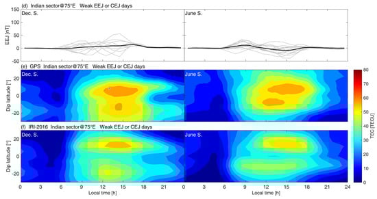 Similar to Figure 3, but during days that the average EEJ intensity at 0800–1200 UT was relatively low (refer to WEC days) at Peruvian sector (a–c) and Indian sector (d–f). The lack of equinox results in (d–f) is due to that the WEC days are not found.