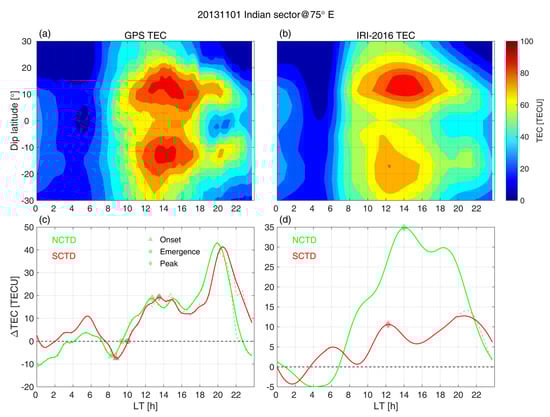 Figure 5b,d show the IRI-2016 predicted TEC map and the corresponding CTD profiles, respectively. Besides a clearly different morphology of EIA structure (Figure 5b) compared with the GPS TEC measurements (Figure 5a), the IRI-2016 derived CTD also exhibited abnormal local time evolution. In detail (Figure 5d), there is no post-sunrise falling that ends in negative vales for NCTD; SCTD showed persistent positive value during 0700–2300 LT. Thus, the onset, as well as the first emergence of the EIA crest, can neither be identified on the IRI-2016 CTD. Only the peaks of the EIA crest can be marked as the peaks of CTD profiles. Note that a similar situation is a common feature for IRI-2016, though the three time points can be occasionally identified.