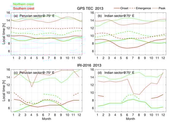 Figure 6c,d show the IRI-2016 predictions. As has been mentioned above, the onset and the emergence of EIA sometimes cannot be identified from IRI-2016 data. It can be witnessed that the onset and emergence data are sparse, due to the incapability for identifying those time points on CTD profiles. Nevertheless, the available time points generally predicted earlier onset and emergence, compared with those of the GPS observations. Interestingly, the annual cycle of EIA onset time is a prevailing phenomenon in both Peruvian and Indian sectors, while GPS revealed a semiannual cycle seen in the Peruvian sector. However, a similar semiannual cycle seen in GPS observation can be found on the peak time of the northern crest in the Peruvian sector (Figure 6c). Besides, the emerging time of the southern crest also exhibits semiannual variation (Figure 6c), but in the same phase of the time points of the northern crest seen in GPS observations (Figure 6a). It can be concluded that, although the semiannual cycle can be occasionally found on the emerging and peak time of EIA crest from IRI-2016, the onset time of EIA still shows the classic picture that the crest in the winter hemisphere develops earlier than that in the summer hemisphere. Note that the IRI-2016 derived peak time of EIA sometimes shows abnormal values (e.g., April at Peruvian sector, July and August at Indian sector, as shown in Figure 6c,d); this also indicated the inaccuracy of the IRI-2016 in retrieving EIA evolution.