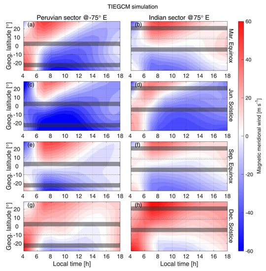 Effective magnetic meridional winds (positive northward). Avergaed winds centered on the days of (a,b) March Equinox, (c,d) June Solstice, (e,f) September Equinoxes, and (g,h) December Solstice, at Peruvian (left column) and Indian sector (right column). The dash line marks the dip equator, the two shaded bars in each plot mark the ‘fixed crest’ defined in this study at dip latitude of 10°~15° S/N.