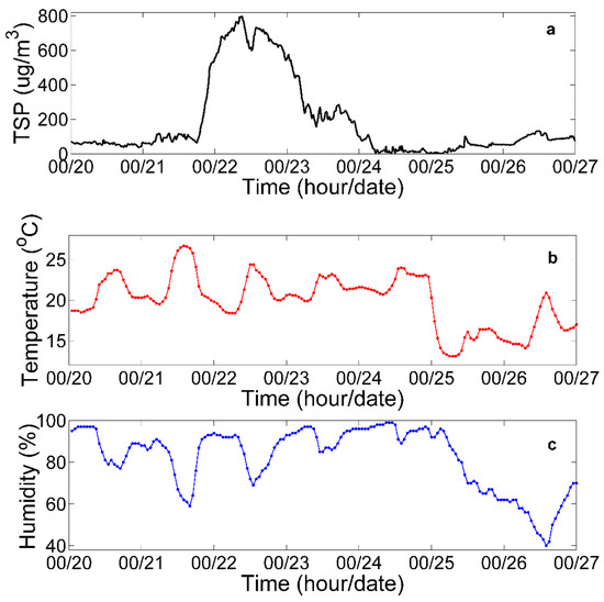 The variation of total suspended particulates (TSP) concentration and meteorological conditions, including temperature, humidity, wind direction, and wind speed measured in Macao, are shown in Figure 3. All the data were measured from 00:00 on 20 March to 00:00 on 27 March, with a 15 min temporal resolution.