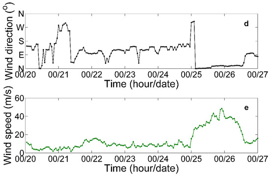 Figure 3a shows that the total suspended particulates concentration was very low before 21 March, and it had weak growth on that day before 18:00. After 18:00, the concentration increased sharply, and the TSP concentration was up to 799.06 µg·m−3 at 09:00 on 22 March. Then it gradually decreased and returned to the range of values before the dust storm. Figure 3b shows the variation of temperature. Obviously, the daily maximum temperature was 26.7 °C on the 21st, on which day the particulates concentration began to increase. Figure 3c shows the humidity was more than 59% in the dust episode. There was a shape drop in temperature on the 25th, and the minimum temperature was only 13.1 °C, while the humidity gradually decreased. The minimum humidity value was 40% and appeared on the 26th. The variations of wind direction and wind speed are shown in Figure 3d,e. The surface wind could influence the diffusion of pollution particles. Under the influence of a surface north wind on the 21st, dust particles from the north accelerated the southward movement. After the dust episode, the wind speed became stronger on the 25th and 26th, and the dust particulates concentration kept at a low level.