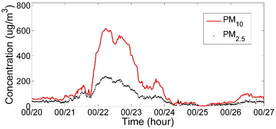 Figure 4 presents the PM10 and PM2.5 concentrations in the dust episode. The red line and black dots represent the PM10 and PM2.5, respectively. A significant increase in PM10 and PM2.5 concentrations was found after 18:00 on 21 March. Before 21 March, the PM10 concentration was much lower, and the average value was only 60.16 µg·m−3. PM10 concentration had weak growth on 21st; however, it increased rapidly after 18:00. At 5:30 on 22nd the PM10 concentration was up to its maximum value 616.83 µg·m−3, which was ten times more than the average value before. Then, the high concentration maintained for a period of time and slowly decreased subsequently. Data show that the average value dropped to 31.27 µg·m−3 on 24th. By comparing the two curves in Figure 4, it is obvious that during the dust period, particles of large size (2.5~10 μm) are of domination in the suspended particles, which is different from that in non-dust periods when the domination is small particles (2.5 μm or less).