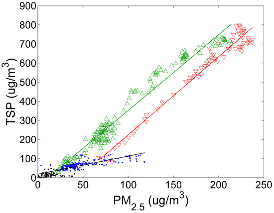 The correlation between PM2.5 and TSP concentrations. Black dots represent results measured between 00:00 on 19 March and 18:00 on 21 March; green triangles represent results measured between 18:00 on 21 March and 08:00 on 23 March; red triangles represent results measured between 08:00 on 23 March and 05:00 on 24 March; blue dots represent results measured between 05:00 and 24:00 on 24 March.