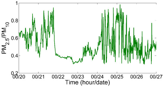 For further research, Figure 6 reports the PM2.5/PM10 ratio during the measurement. Before the sharp rise in particulate matter concentration, the PM2.5/PM10 ratio was about 0.6, which indicates a larger contribution of small particles before the dust event. When the dust particles were transported to Macao, the PM2.5/PM10 ratio quickly decreased. During the dust episode, the average value of PM2.5/PM10 ratio was only 0.36. The peak concentration of PM2.5 was 237.26 µg·m−3, and the peak concentration of PM10 was 616.83 µg·m−3 at the same time, when the value of PM2.5/PM10 was 0.38. It highlighted a greater contribution of large particles (2.5~10 μm) in the dust event, indicating that the proportion of fine particles (2.5 μm or less) was small. Table 2 summarizes the daily mean values of PM concentrations as well as the PM2.5/PM10 ratio for the period 19–26 March.