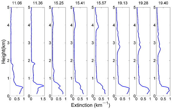 Figure 8 shows the detection results of the moderate pollution day on 26 March. The variation of extinction coefficients with height was very small below 2 km. There existed multiple layers of aerosol aggregation between 2.5 km and 5 km, and the near-surface extinction coefficients on 26th were smaller than that on 22nd.