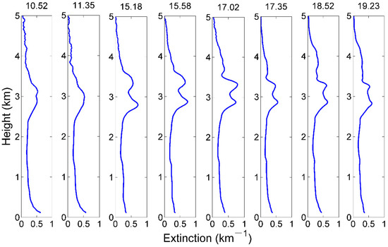 Lidar measurements in Macao enable us to study and characterize the vertical profiles of aerosol optical properties in the dust episode and follow its spatial and temporal evolution. The extinction coefficients inverted from Mie lidar in suit measurement are presented in Figure 7 and Figure 8. We report the results on the day of the dust event (22 March) and afterwards (26 March). Each of these profiles is an average of the results over 15 min with a spatial resolution of 3.75 m. The starting time is marked above.