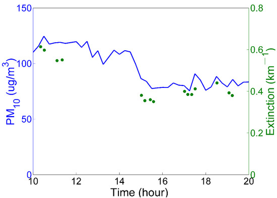 The PM10 concentration from SMG and the near-surface extinction coefficients obtained from lidar on 26 March are shown in Figure 9. The blue line represents PM10 concentration and green dots represent extinction coefficients at 116 m. As shown in the figure, the extinction coefficients and PM10 concentration values were both higher around 11:00, and decreased after 15:00. They had similar trends and a good consistency in time. It also shows the reliability of the lidar system.