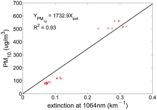 Based on these two reasons, extinction coefficients at 355 nm are not sufficient to show the impact of dust particles on the atmosphere. Taking visibility as the contact among extinction coefficients at different wavelengths will diminish the influence caused by particle size. Figure 10 shows the near-surface extinction coefficients (116 m) at 1064 nm converted by Equation (3) and PM10 concentration values at the same time. The relationship between them can be fitted linearly. The correlation is helpful for inferring the vertical profiles of PM10 concentration in the dust episode and tracing the possible aerosol sources.