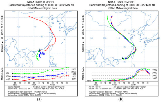 The back-trajectory analysis of dense aerosol layers was simulated by using NOAA’s HYSPLIT model. Details in Figure 11a show that aerosol source materials at height of 1028 m and 1661 m above ground were mainly from the South China Sea. While aerosols at the height of 402 m came from north China, the source materials moved towards the southeast, went through the Yangtze River estuary, turned south along Taiwan Channel, and entered the south China seacoast. Figure 11b shows the aerosol back-trajectory at height of 300 m, 200 m, and 100 m, respectively. They all have similar tracks. Early in March 19th UTC, with the height about 4000 m, aerosols materials were in Mongolia and they dropped to 1000~2000 m when they arrived at Henan area on 20 March UTC. These materials went via Yangtze River estuary, moved along the southeast coast of China, and then reached Macao.