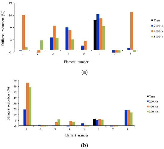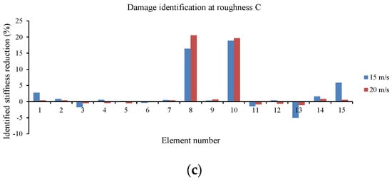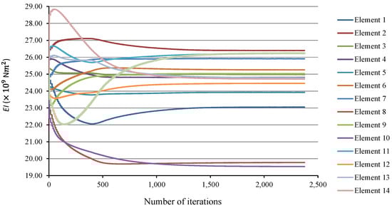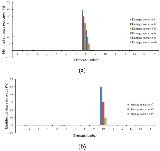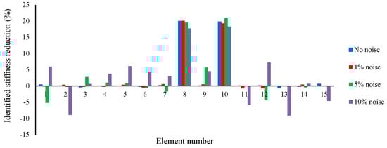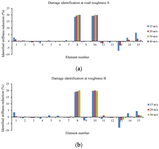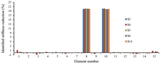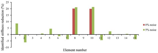 In this section, a detailed study of the effects of damage location and its extension on the accuracy of the proposed method is carried out. Seventeen different damage scenarios are investigated, as shown in Table 3. The vehicle moves over the bridge at speed 40 m/s, and the road surface roughness is assumed to be “A”. Full sensor placement is used. Noise is not considered here. Convergence tolerance is applied as 10−6. Scenarios 16 and 17, including two damaged elements, are intended to investigate the efficiency of the method when there are multiple damaged elements. Results can be found in Table 4, and Figure 1.
