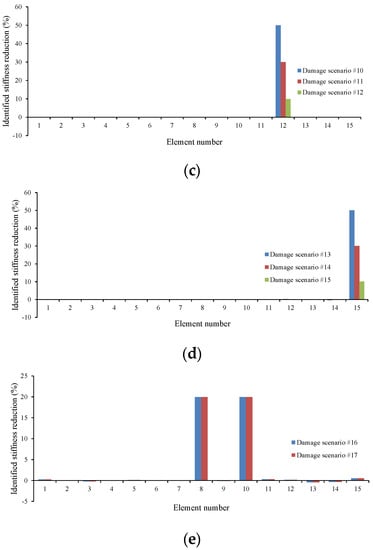 Accuracy of the method for damage scenarios 1–17. (a) Element 8; (b) Element 10; (c) Element 12; (d) Element 15; (e) Elements 8 and 10.