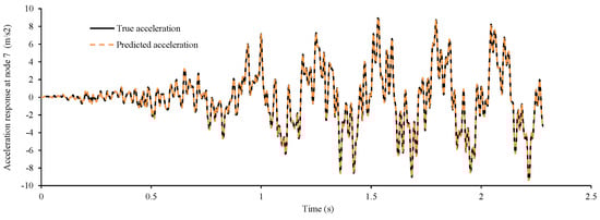 In reality, both true loads and structural parameters are unknown, so it is not possible to quantify accuracy by Equations (17) and (18). In this case, responses can be reconstructed by inputting the identified moving loads and structural parameters into Equation (6). This has two benefits; one of which is to check the accuracy of identification and the other being to predict dynamic structural responses such as acceleration at locations where sensors are unavailable or difficult to install. The error of reconstructed responses can be calculated from Equation (19).