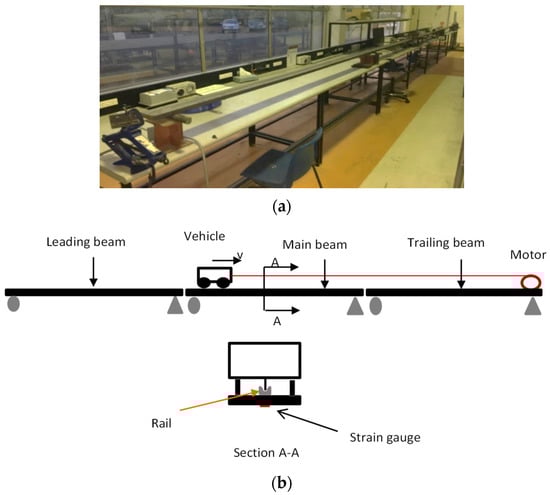 Experimental set-up of the vehicle-bridge system. (a) Laboratory model; (b) Symbolic model.