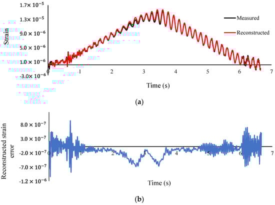 (a) Measured and reconstructed strain at mid-span (b) Error of reconstructed strain (Damage case 1—speed 0.94 m/s—sampling frequency 800 Hz).