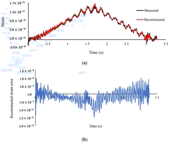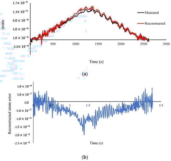(a) Measured and reconstructed strain at mid-span (b) Error of reconstructed strain (Damage case 2—speed 0.94 m/s—sampling frequency 800 Hz).