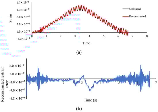 (a) Measured and reconstructed strain at mid-span (b) Error of reconstructed strain (Damage case 1—speed 0.47 m/s—sampling frequency 800 Hz).
