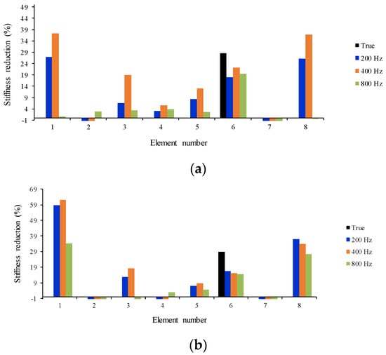 where and are the element stiffness matrices of the undamaged and damaged beam, respectively. The value of ranges between 0 and 1, where indicates no stiffness loss in the element while indicates the stiffness of the element is completely lost.