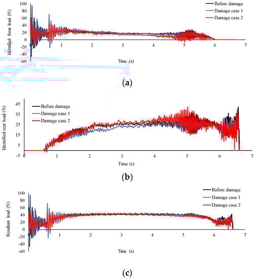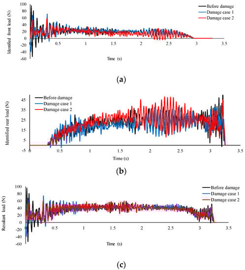 The effect of damage on the identified moving loads at speed of 0.94 m/s (sampling frequency 800 Hz); (a) front load; (b) rear load; (c) resultant load.