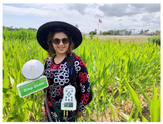 A Crop Circle ACS-430 (Holland Scientific Inc., Lincoln, NE, USA) was used in 2019 to collect canopy reflectance data at 670, 730, and 780 nm (red, red-edge, and NIR spectral bands) from rows 2 and 3 and rows 10 and 11 of each plot (Figure 1). Spectral reflectance data were simply and instantly recorded as a CSV file on a SD flash card using the Holland Scientific GeoSCOUT X datalogger (Figure 2). It also measured the NDVI and NDRE values directly with geolocation of each point 10 times per second (10 Hz). The sensor’s field of view was an oval of ~30 degrees by ~14 degrees. The sensor to canopy distance is suggested to be between 25 to 180 cm; however, in this research, the sensor was held at a consistent height of approximately 60 cm above the canopy, with a sampling speed of 10 Hz, while moving through each plot at a constant pace. The Crop Circle ACS-430 denotes reflectance measurements as Pseudo Solar Reflectance (PSR), which means the spectral reflectance wavelengths are scaled as percentages and will not differ in sensor height above a target [32]. The Crop Circle ACS-430 has an internal GPS to record the latitude, longitude, and elevation of each point, but it was not considered accurate enough for our purposes. Therefore, it was connected to a Piksi Multi Evaluation Kit (Swift Inc., Rocky View County, AB, Canada) as a Real-Time Kinematic (RTK) GPS. Data were extracted with a 3 m reduction from the starting edge and end of each plot length. This reduction was applied to skip the first and last crop canopy of each plot to eliminate border effects. Data were collected at three phenological stages (V4, V6, and VT) around 10:30 am. The average reflectance values were computed to represent rows 2, 3 and 10, 11 of each plot (Figure 1). The calculated spectral Vis, using red, red-edge, and NIR, are listed in Table 1.