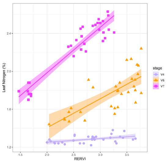 Scatter plots of RERVI versus leaf N percent in different corn growth stages.