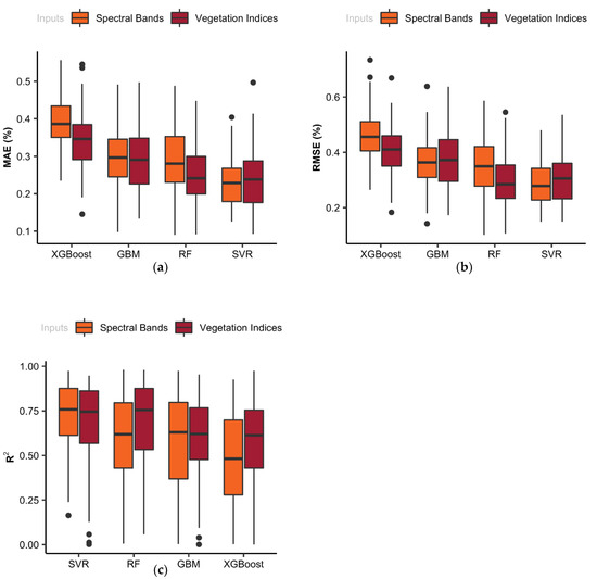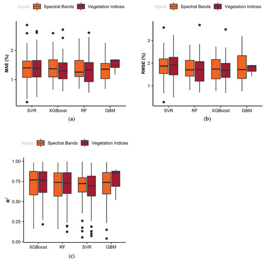The box plots in Figure 5 display the variation in mean absolute error (a), root mean square error (b), and R-squares (c) resulting from the cross-validation of training models. Two groups of box plots are shown in Figure 5, in which the orange plots show the cross-validation results derived from the ML model, which were trained by the VIs, and the brown plots illustrate the cross-validation results derived from the models, which were trained by the spectral raw data. In this study, four non-parametric ML models were used to estimate the leaf N concentration. As indicated in Figure 5, the evaluation metrics were different for all models. For example, in the wavelength-based models, the average R2 values resulting from cross-validations in the training data set were 0.61, 0.48, 0.62, and 0.75 for RF, XGBoost, GBM, and SVR models, respectively. The results indicated that SVR model had the least MAE and RMSE, and the greatest R2, therefore it can be concluded that the SVR model outperformed the other models in almost all performance measures. As illustrated, the SVR model could explain approximately 75% of the variability of N content using wavelength-based inputs. Cummings et al., 2021, evaluated Crop Circle Phenom for in-season diagnosis of corn N status during two years’ growing season in Minnesota, United States. Their results showed that Canopy Chlorophyll Content Index (CCCI) was an important vegetation index for predicting plant N concentration and plant N uptake in both simple regression (SR) and XGB modeling [67].