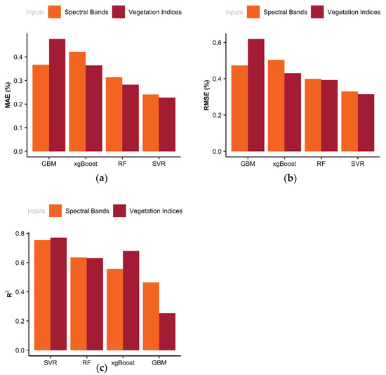Statistical evaluation metrics including (a) mean absolute error (MAE), (b) root mean square error (RMSE), and (c) coefficient of determination (R2) resulted from cross-validation in two sets of machine learning models to estimate leaf N content.
