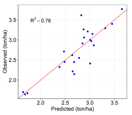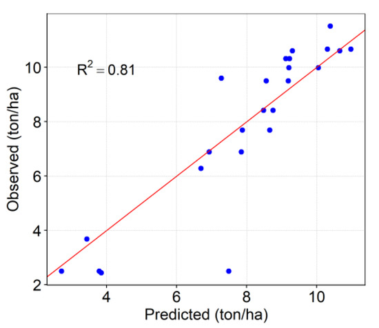 Figure 9 indicates the observed and predicted grain yield using the testing data set. The points under the red line (1:1 line) indicate that the model underestimated grain yield and the points above the 1:1 line represent the overestimation. Good correspondence was found between the observed and predicted grain yield, indicating that well-trained models can predict the grain yield well.