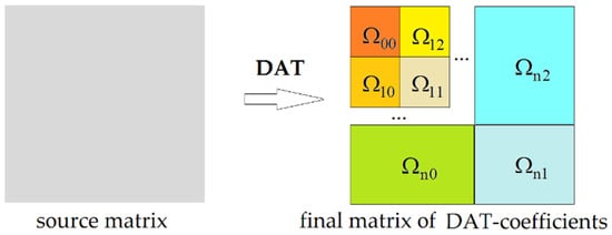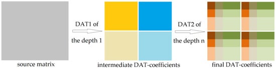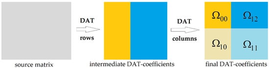 Section 2.1, any matrix M can be processed by DAT of arbitrary structure. Although, in this case, if its rows or columns do not satisfy the length condition mentioned, then application of the extension procedure is required. This leads to an increase in the number of DAT coefficients. Nevertheless, since atomic wavelets have zero mean value [