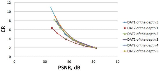 Figure 13 shows the dependence of CR on PSNR. It follows that there is no significant difference between results obtained for different structures of DAT. Furthermore, we see that indicators MAD, RMSE, PSNR, and CR belong to segments obtained when processing ESA images.