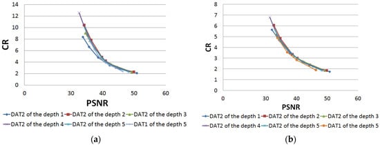 Besides, it is shown that there is no significant difference in the mean value of CR provided by DAT1 and DAT2 (except the case of the depth 1) for any distortions measured by PSNR (see