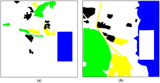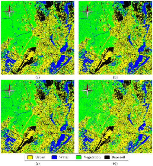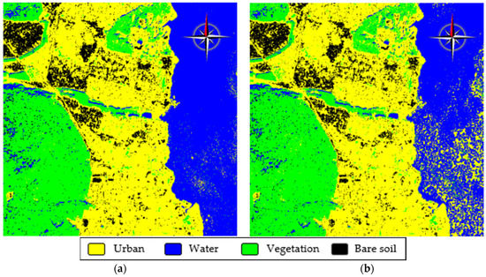Second, since there are overlappings in the feature space, there are misclassifications. In particular, the pixels belonging to the class Bare Soil are often recognized as Urban and vice versa. This is not surprising and always happens in RS data classification for classes “close” to each other.